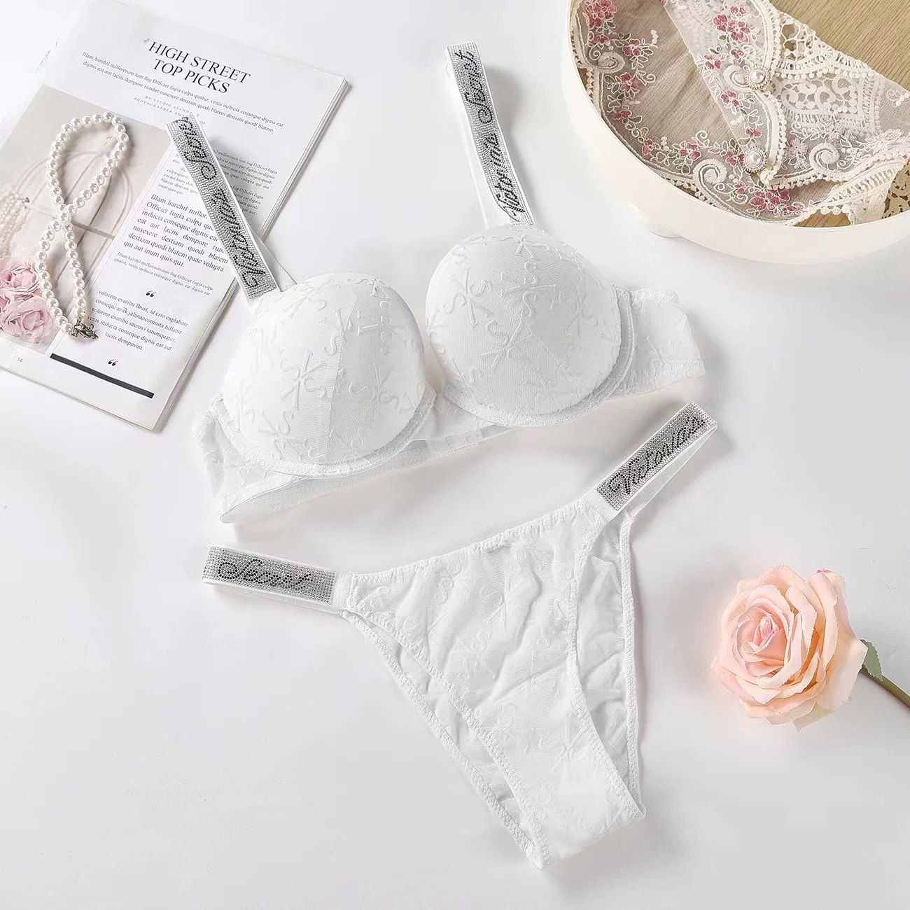 A premium and stylish lingerie set featuring floral lace fabric and iconic shimmering rhinestone-embellished straps. Designed for both comfort and a glamorous look, providing a flattering fit with adjustable shine straps.