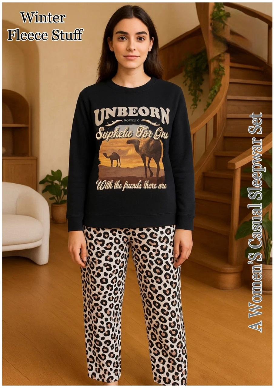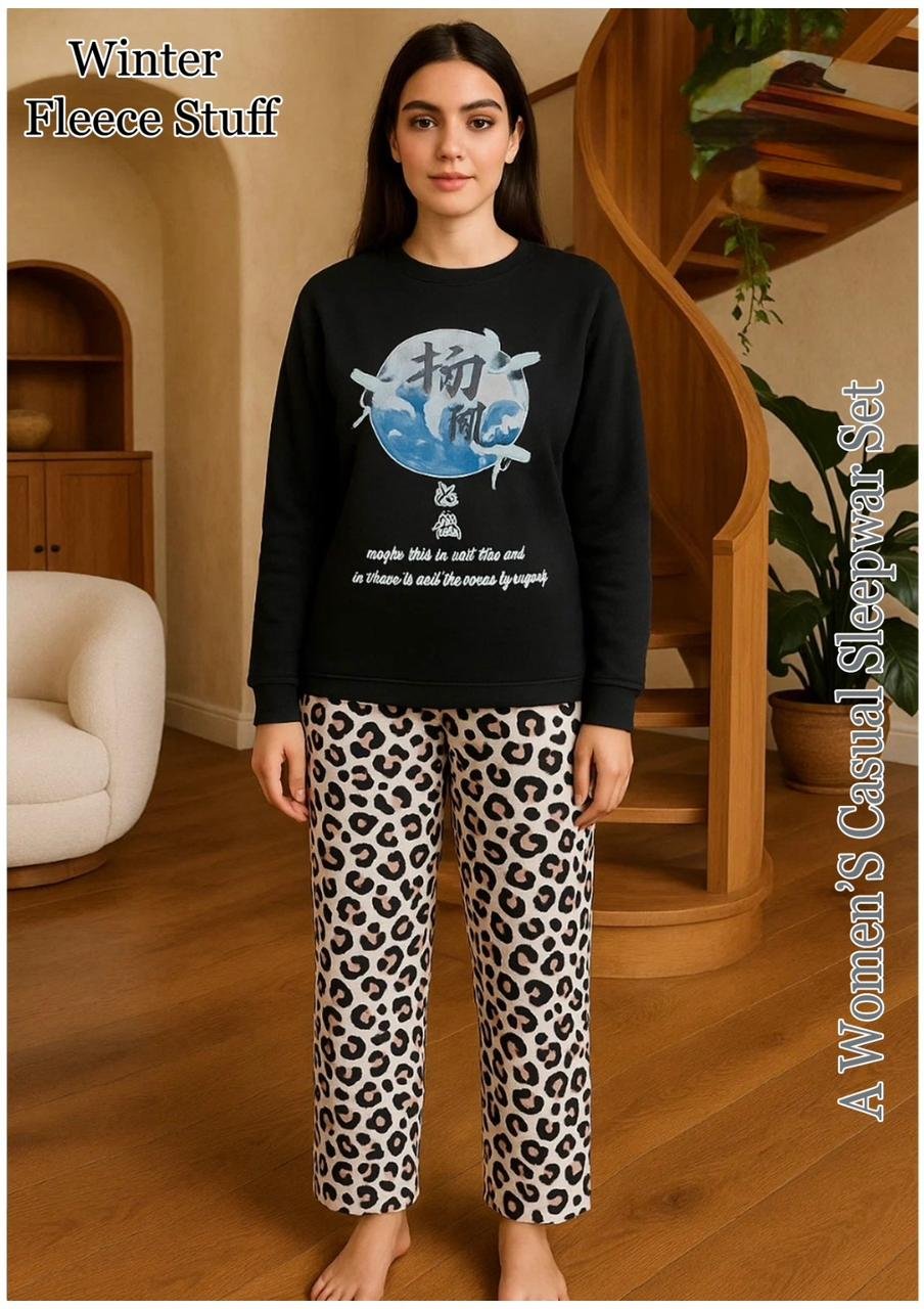 A trendy winter lounge set crafted from thick Winter Fleece Stuff. The black sweatshirt top is paired with leopard print pajama pants, making it both stylish and practical for home wear in winter.