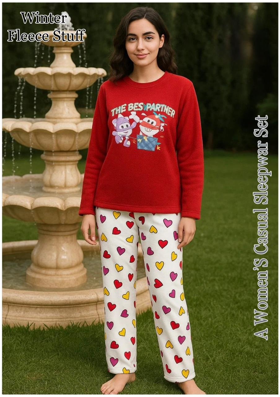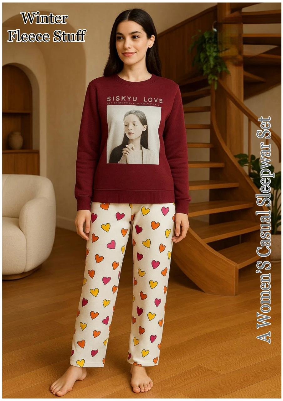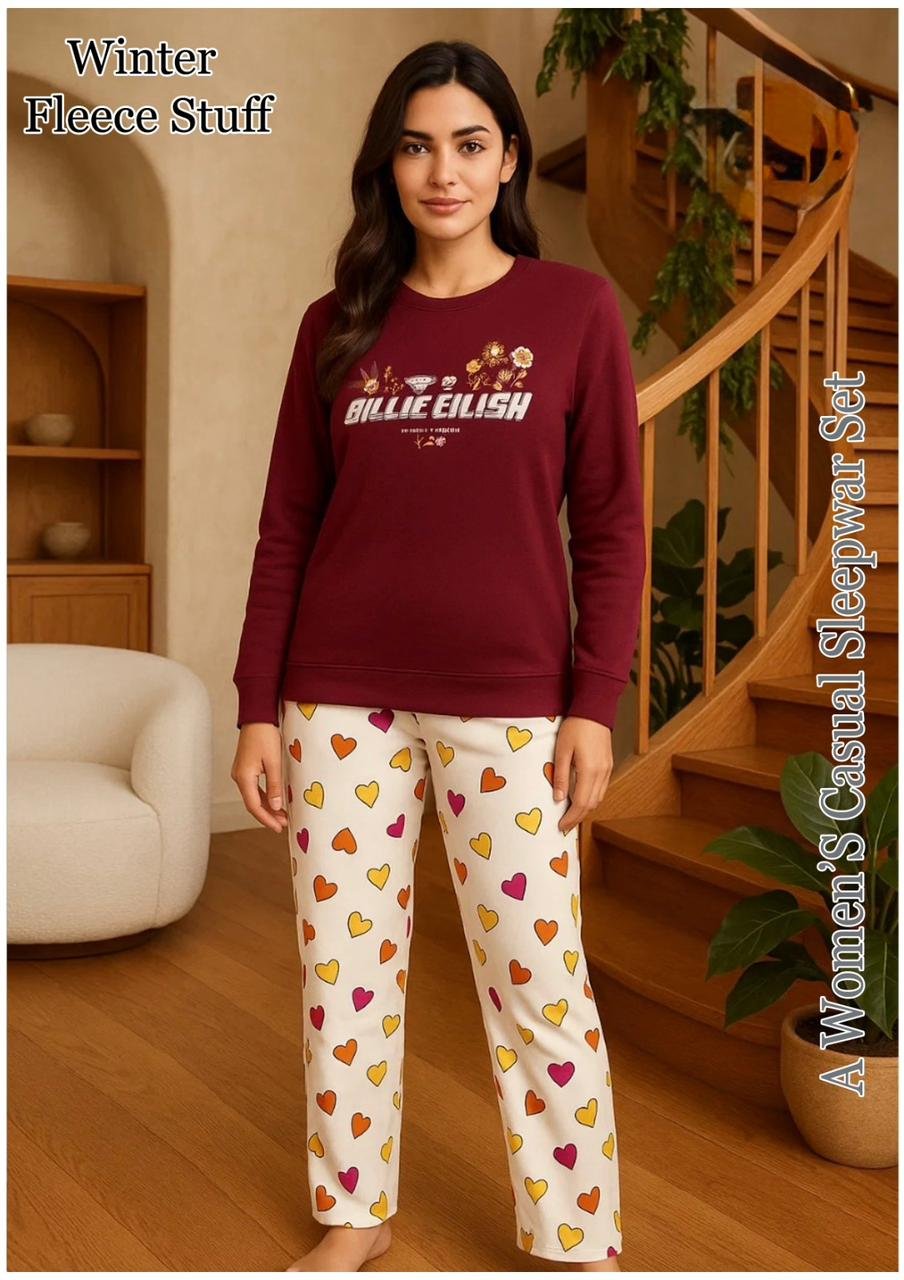 A cozy two-piece winter set made from Winter Fleece Stuff. The top features various graphic prints (including Billie Eilish or character themes), and the set is designed for warmth and comfort during cold weather.