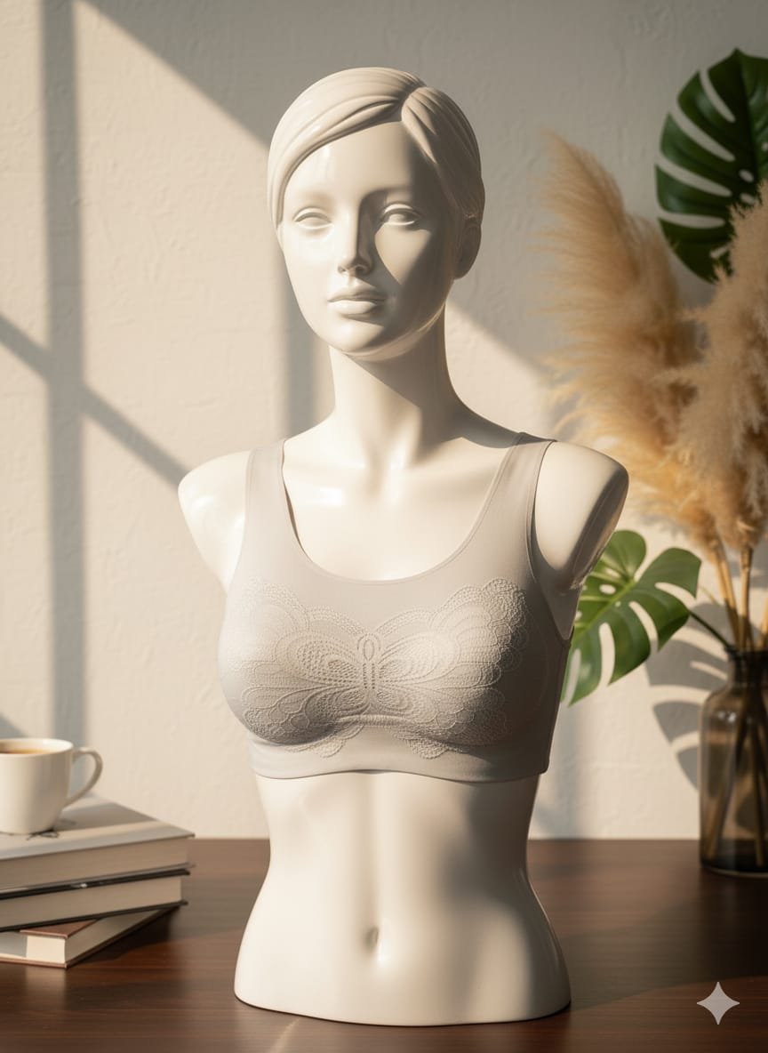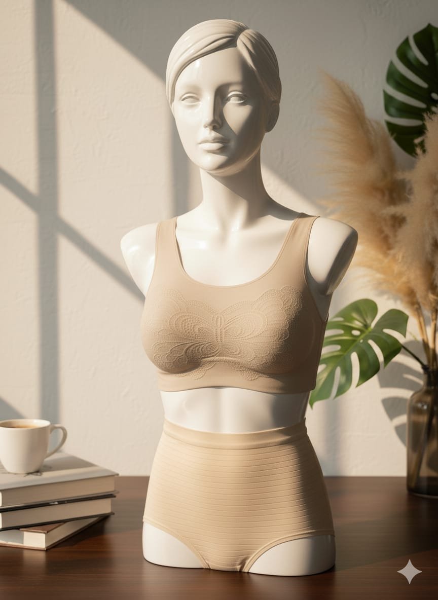 A premium, wireless seamless bra featuring a beautiful laser-cut butterfly embroidery design on the front. Designed for a “flawless fit,” it provides a smooth look under outfits. The set includes a matching high-waist foundation panty for tummy control and body shaping.